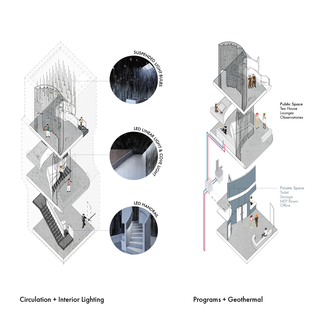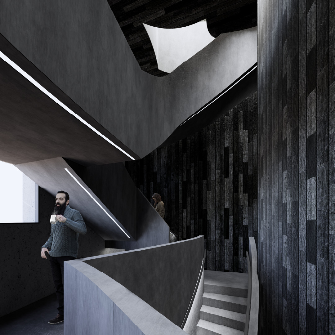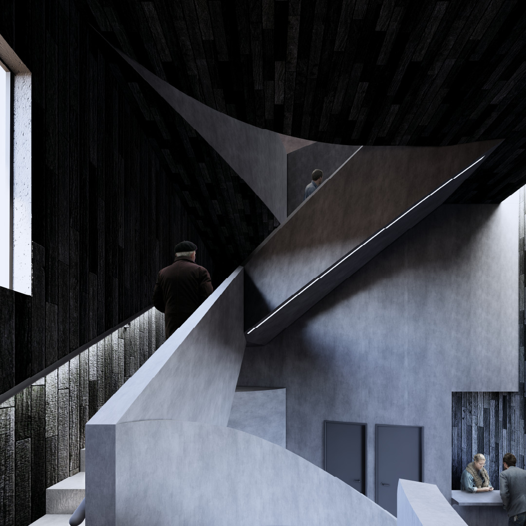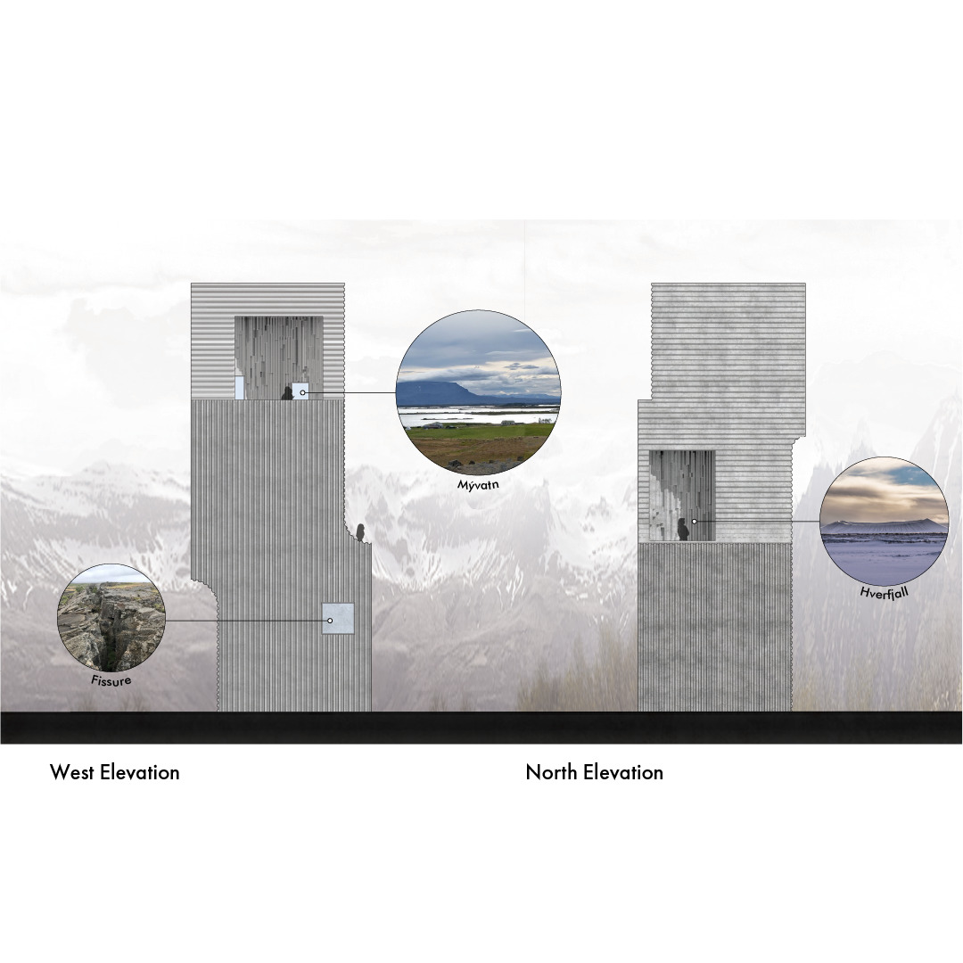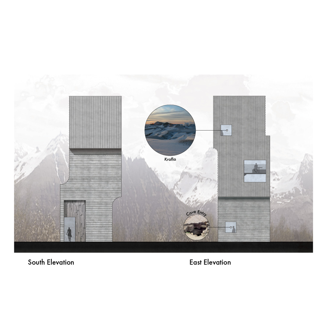 외무마감은 여러 레이어의 메탈데크의 콜라주를 거푸집으로 활용해 아이슬란드 현무암 기둥의 질감을 살린 거푸집의 물성을 활용한 곡선의 콘크리트 벽이 건축의 Geomtry를 구성합니다. 실내에 들어서면 연속적인 계단을 따라 갈라진 석판을 통과하여 주 전망대와 찻집 라운지가 있는 최상층에 도달할 수 있습니다. 그을린 목재 마감으로 마감된 내부 분위기는 여행을 풍요롭게 하는 동굴에서의 경험을 표현하며 방문객에게 시각적인 즐거움과 후각적인 즐거움을 동시에 선사합니다.