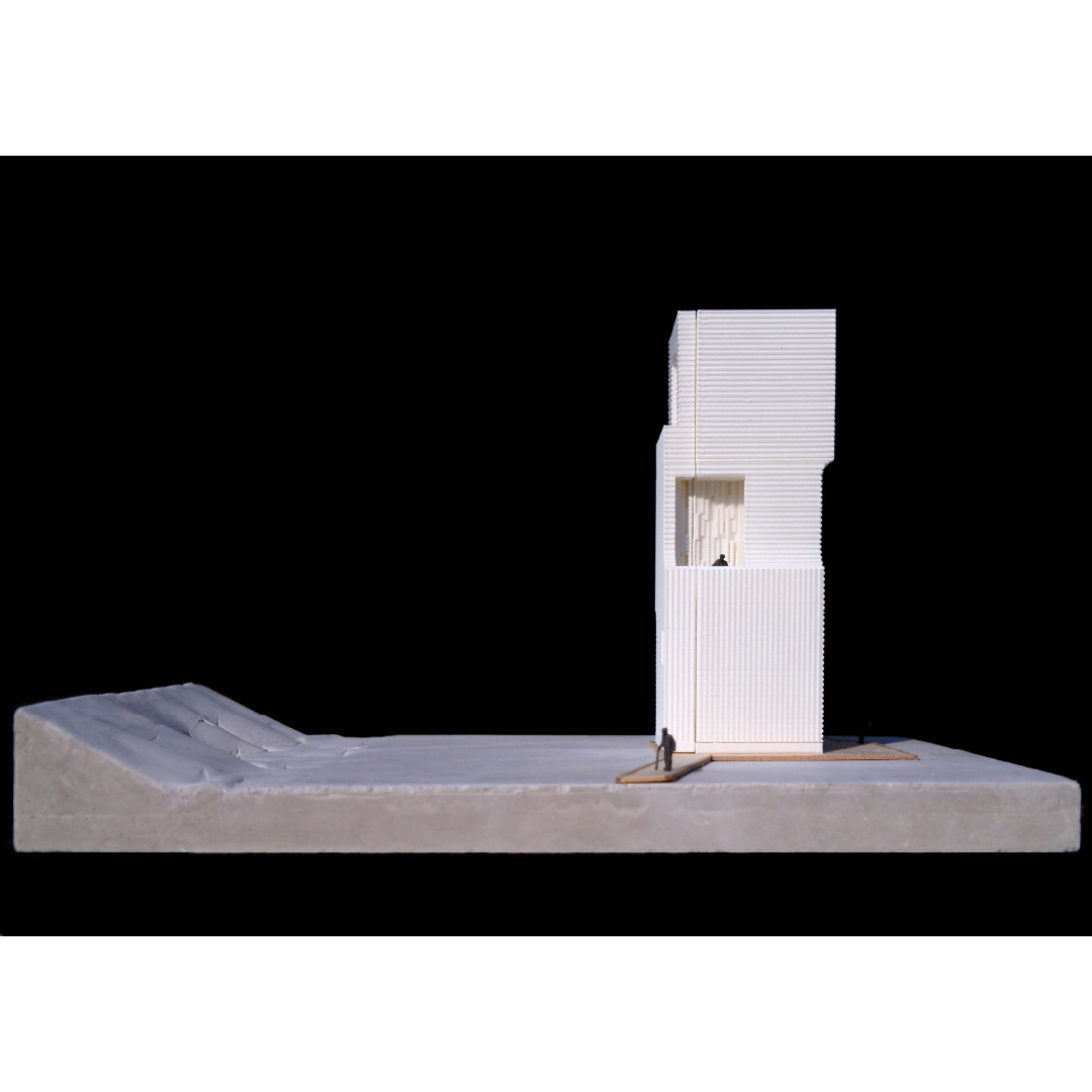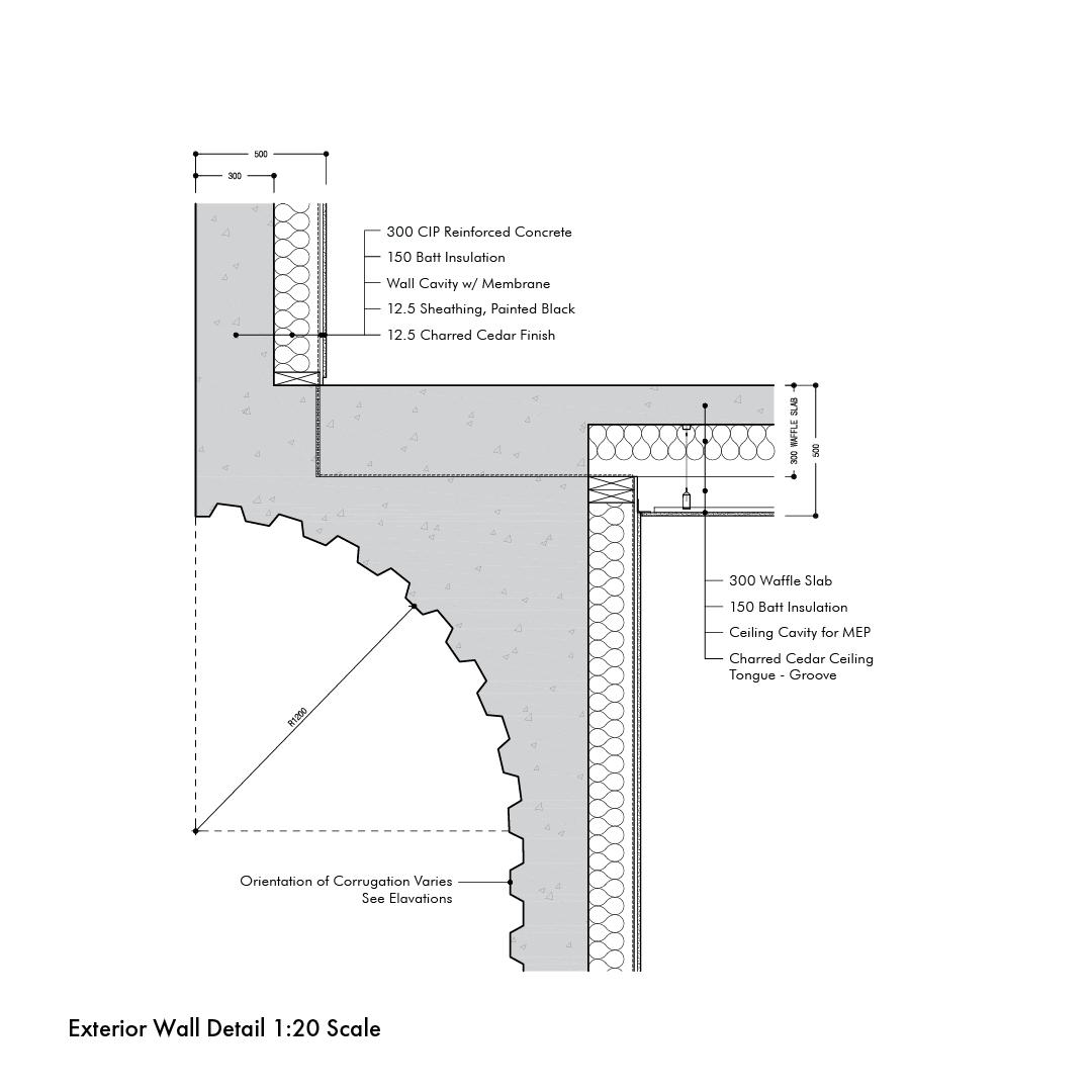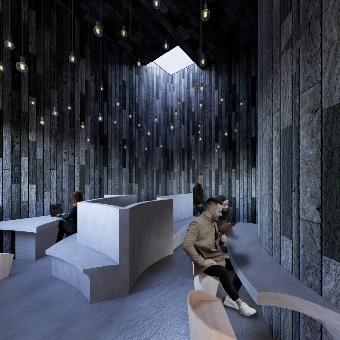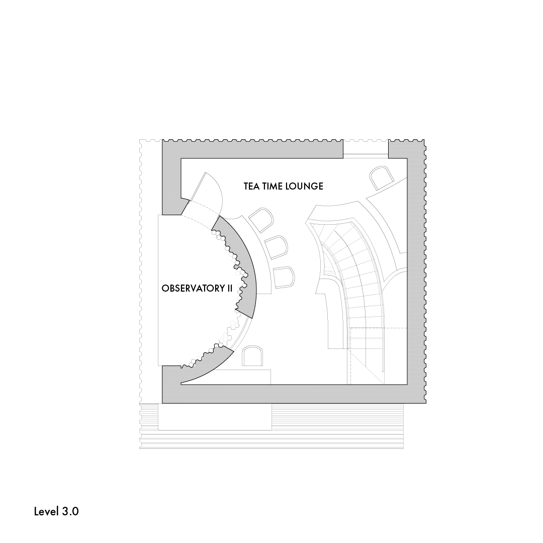 외무마감은 여러 레이어의 메탈데크의 콜라주를 거푸집으로 활용해 아이슬란드 현무암 기둥의 질감을 살린 거푸집의 물성을 활용한 곡선의 콘크리트 벽이 건축의 Geomtry를 구성합니다. 실내에 들어서면 연속적인 계단을 따라 갈라진 석판을 통과하여 주 전망대와 찻집 라운지가 있는 최상층에 도달할 수 있습니다. 그을린 목재 마감으로 마감된 내부 분위기는 여행을 풍요롭게 하는 동굴에서의 경험을 표현하며 방문객에게 시각적인 즐거움과 후각적인 즐거움을 동시에 선사합니다.