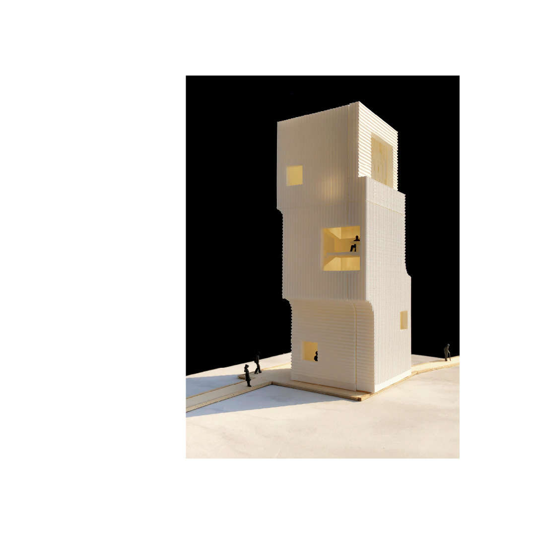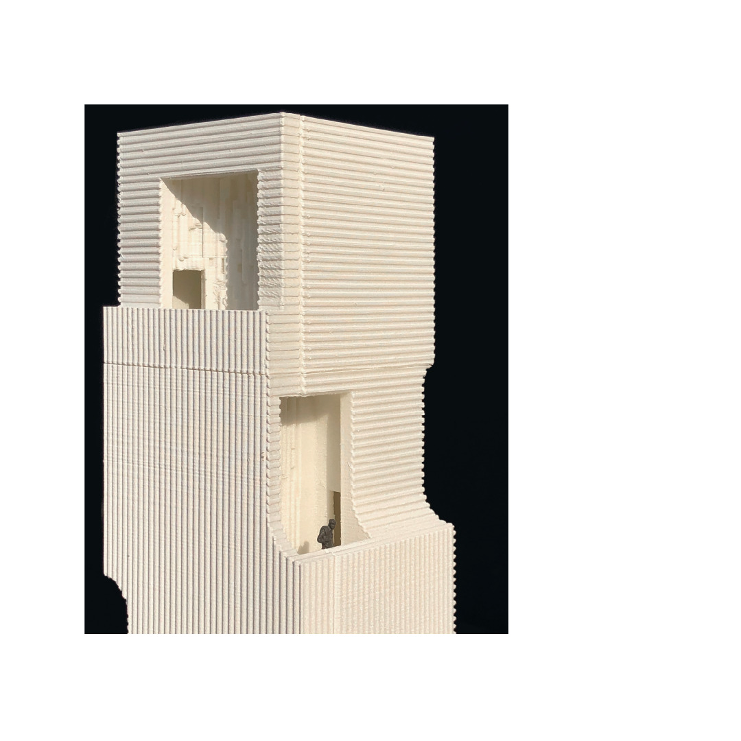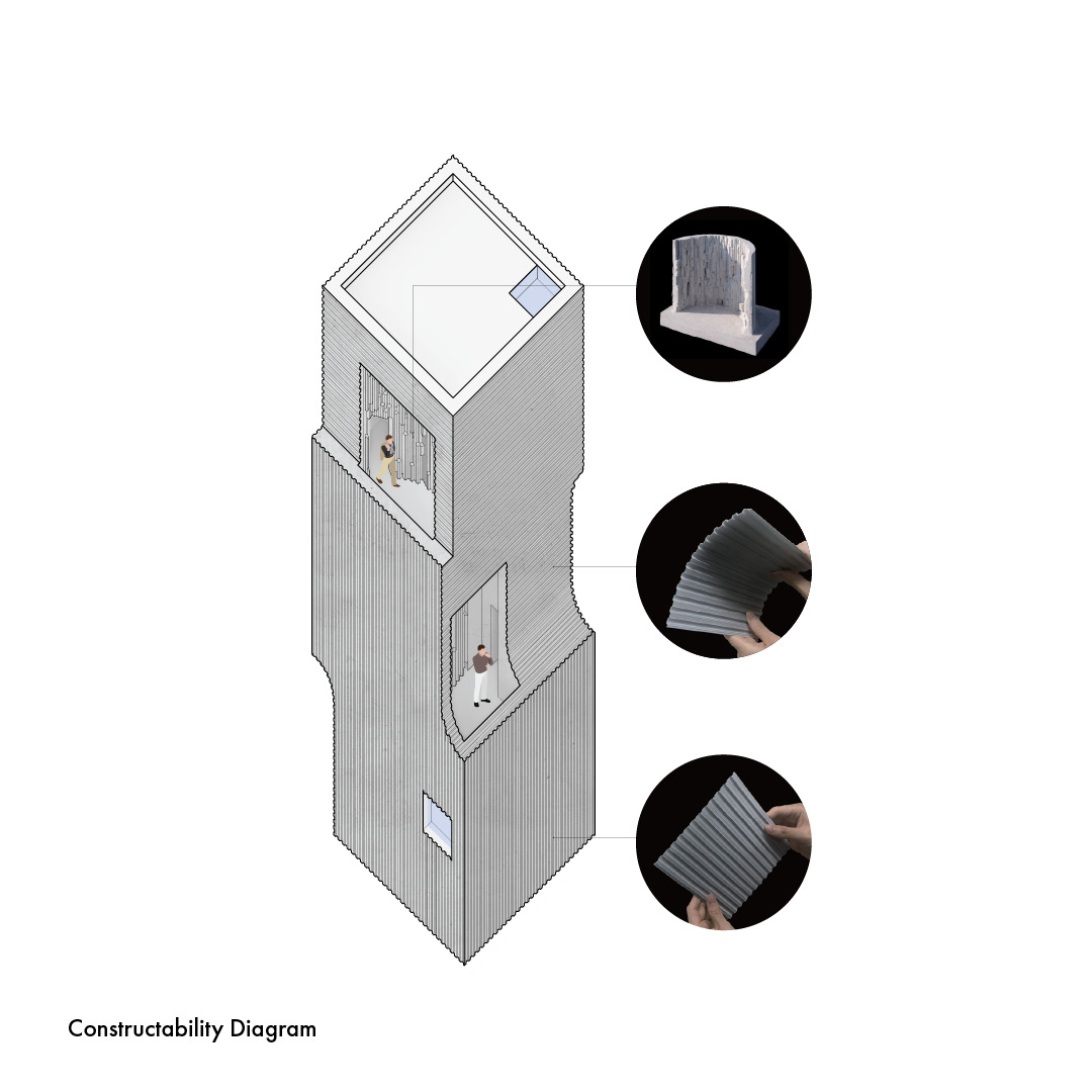 바다에서 볼 수 있는 Sea Stack이 원거리에서도 우리에게 강한 인상을 주는 것처럼, Fissured Stack은 수직적인 존재감을 표현하여 방문객들이 멀리서도 타워를 쉽게 알아볼 수 있도록 합니다.