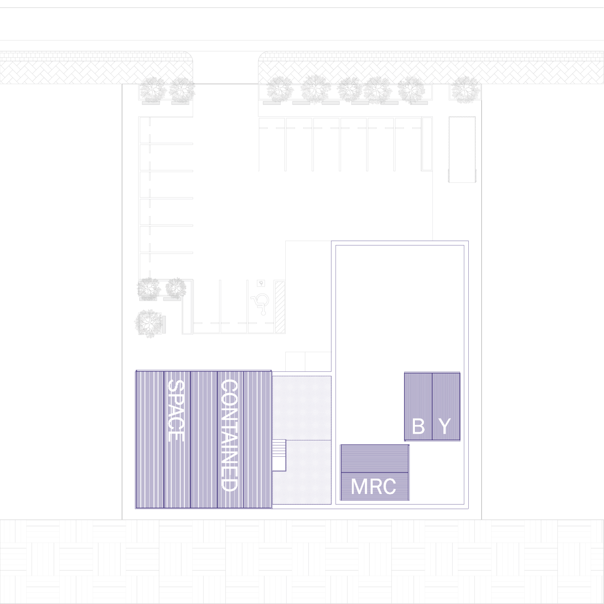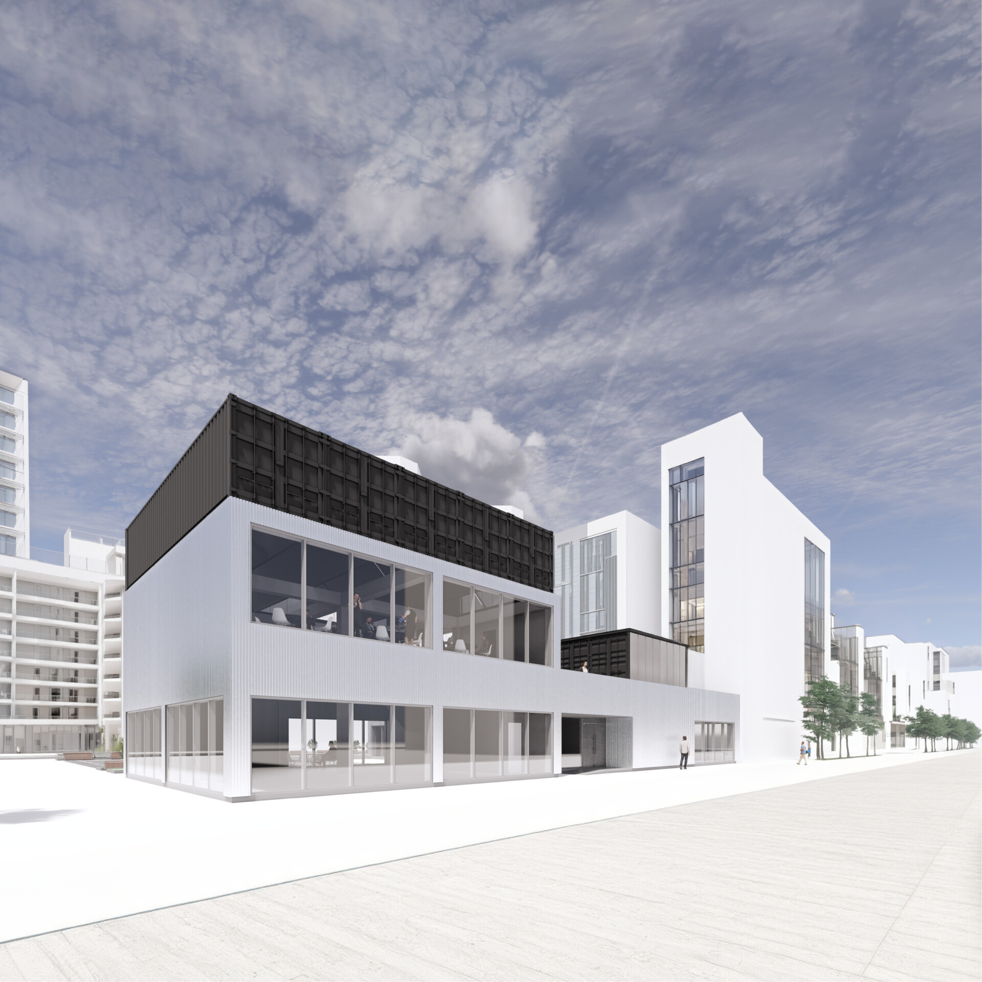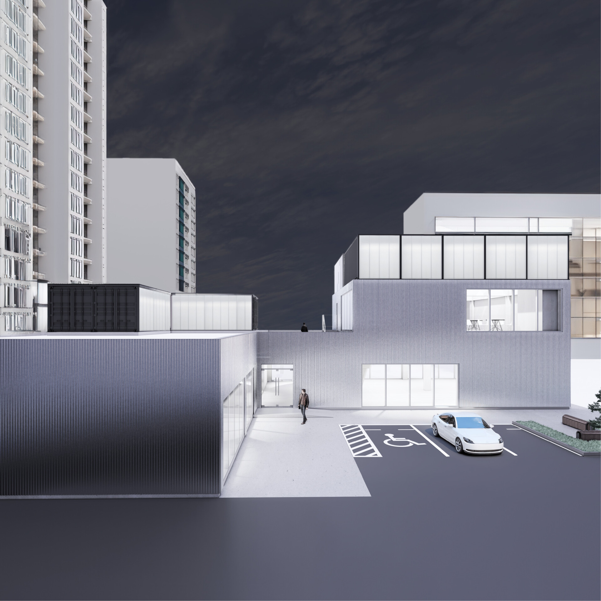 인근 아파트 거주민들과 상대적으로 높은 건물들에서 CONTAINED SPACE를 내려다보는 모습 또한 설계에 고려되어, 컨테이너에서 볼 수 있는 거대한 크기의 문구와 다양한 크기의 정사각형 형태의 조합으로 랜드마크적인 요소를 더하였다.