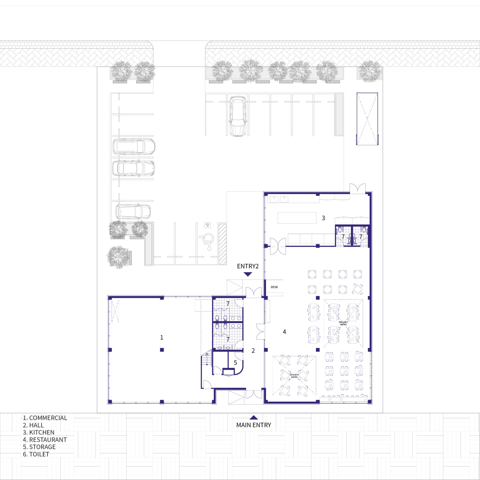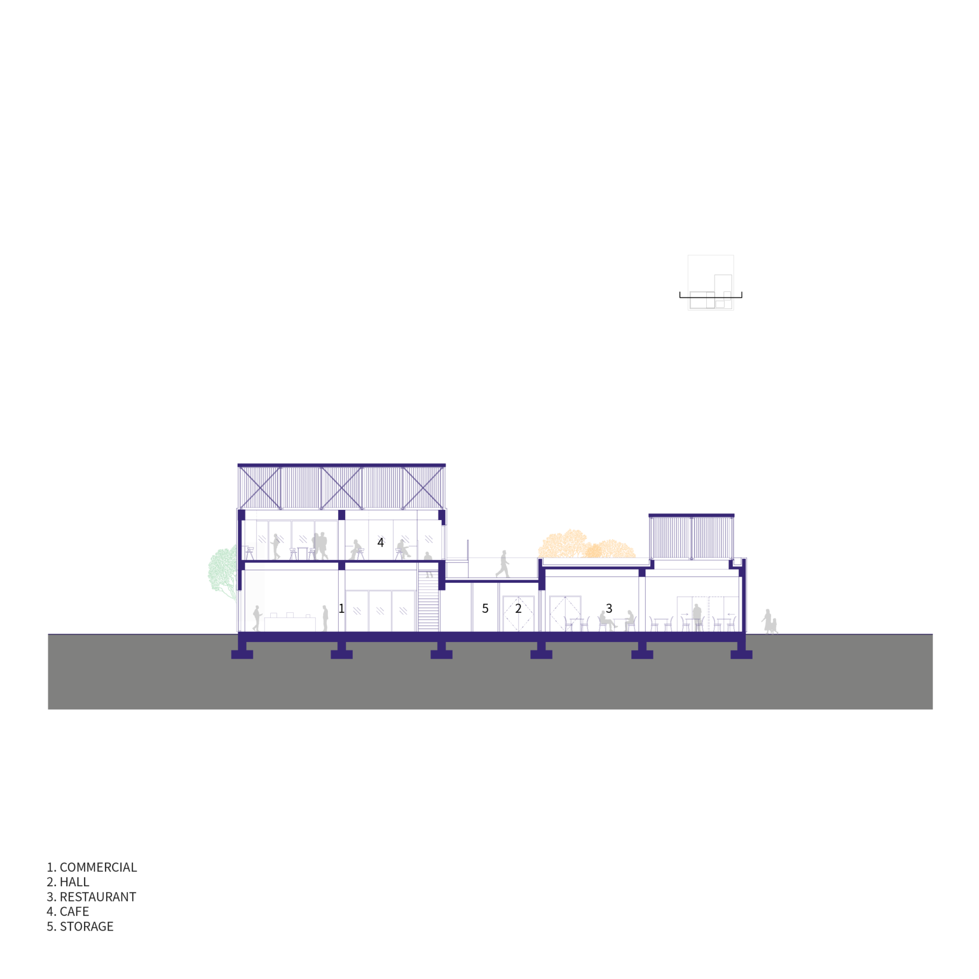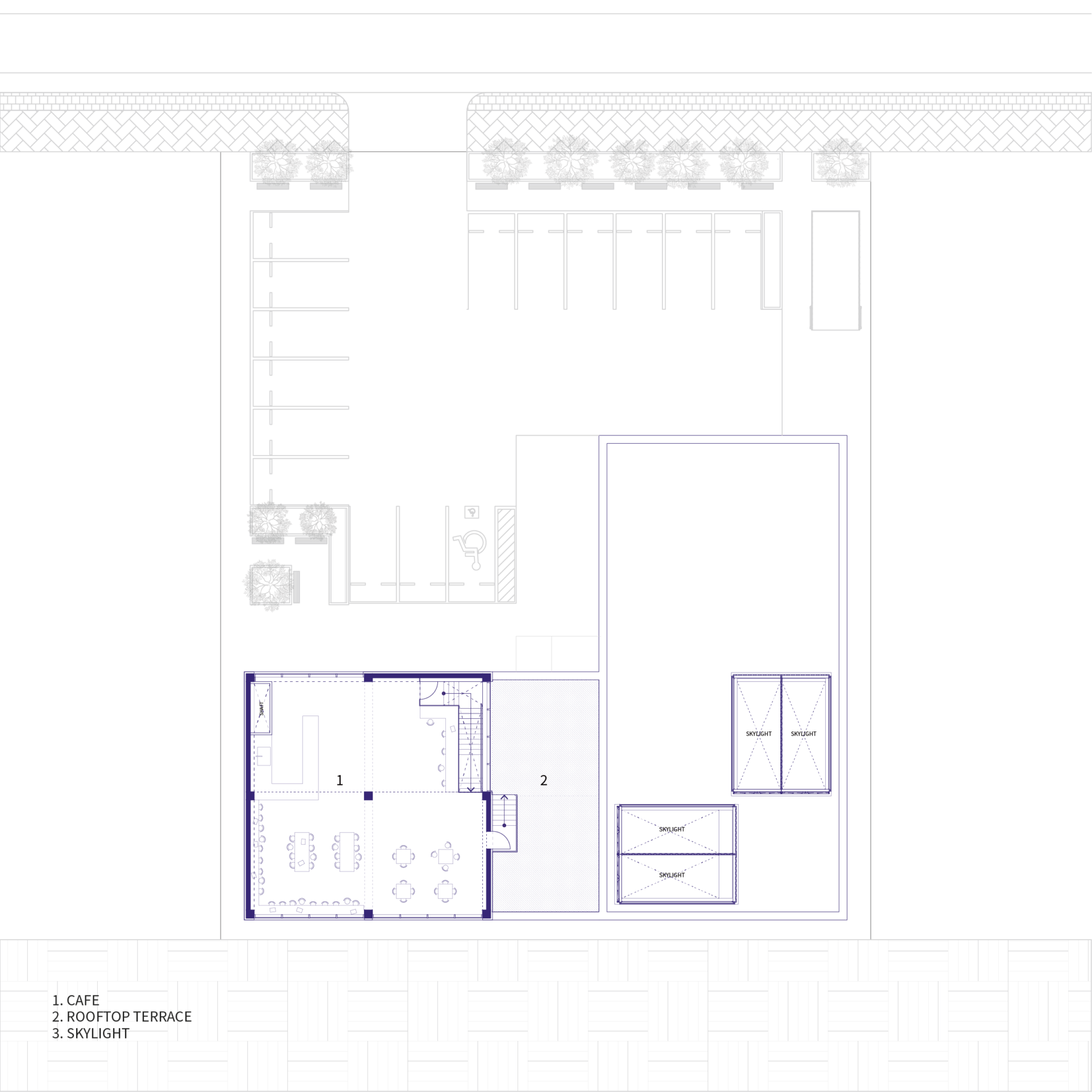 인근 아파트 거주민들과 상대적으로 높은 건물들에서 CONTAINED SPACE를 내려다보는 모습 또한 설계에 고려되어, 컨테이너에서 볼 수 있는 거대한 크기의 문구와 다양한 크기의 정사각형 형태의 조합으로 랜드마크적인 요소를 더하였다.